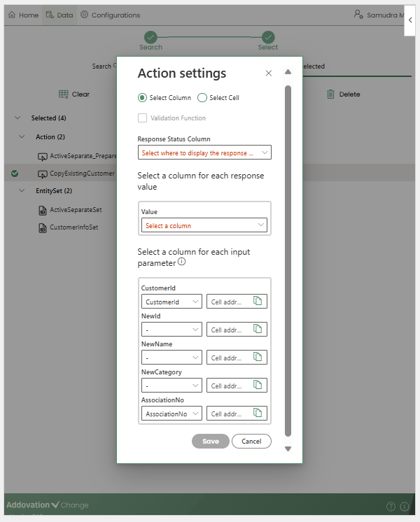 Modify the input and output table selections