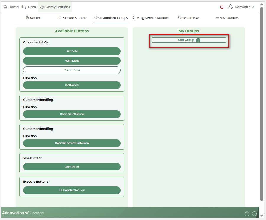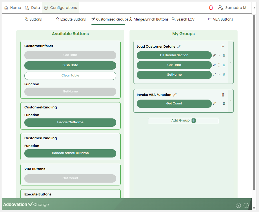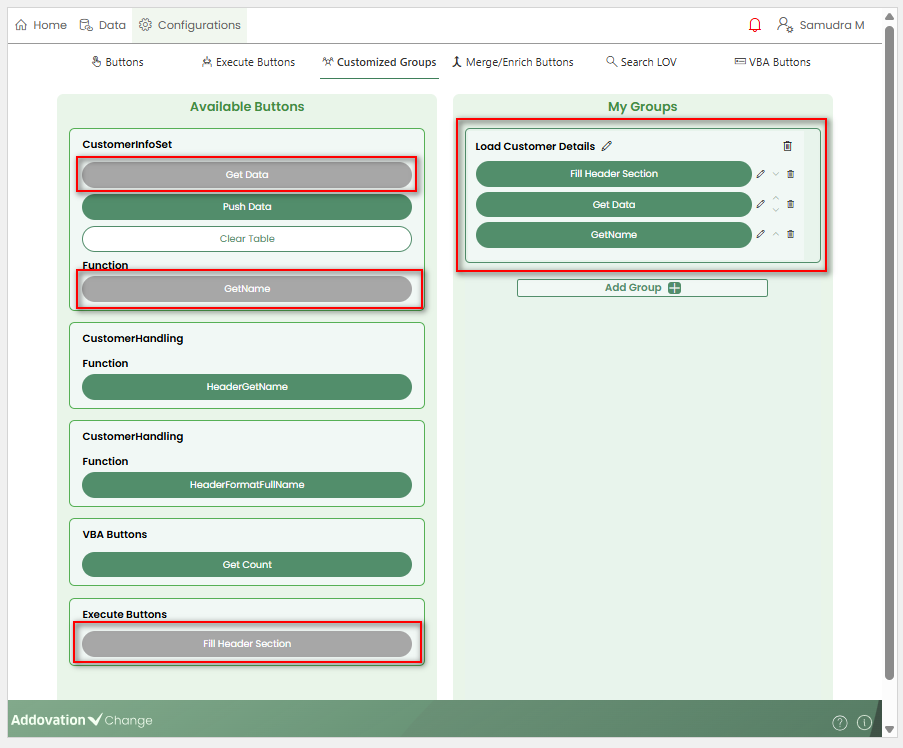 Similar to other buttons, Merge/enrich Buttons can also be included inside the customized groups.