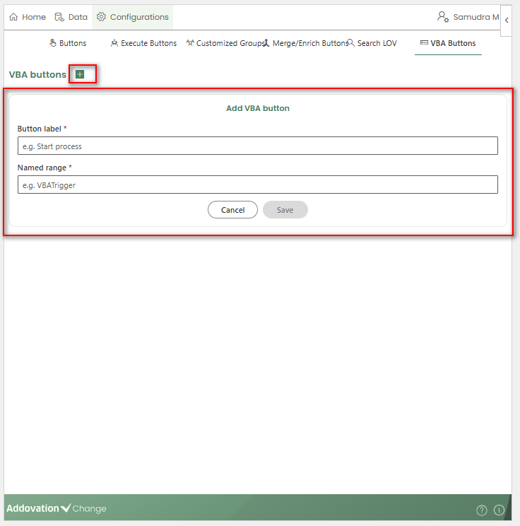 +icon under the VBA Buttons tab. A new section expands to capture the configuration details.