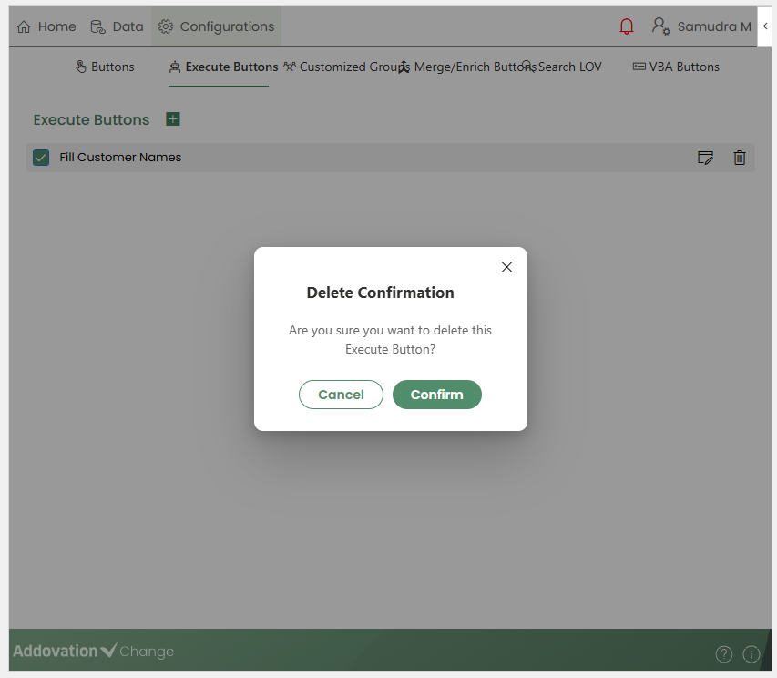 Clicking Delete displays a confirmation message. Once confirmed, the selected Merge/Enrich Button is deleted.