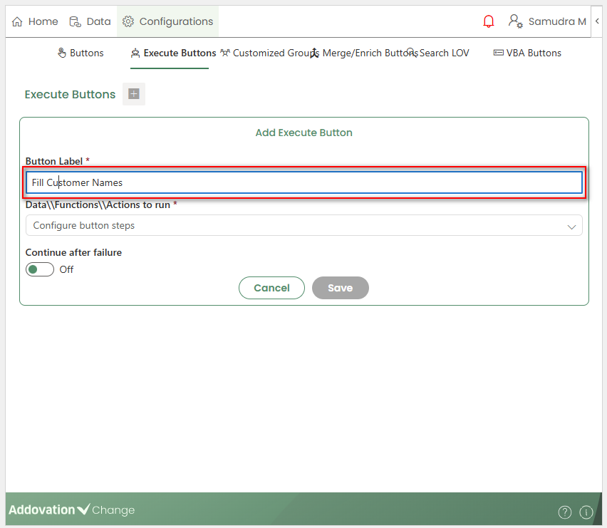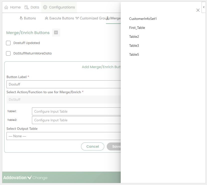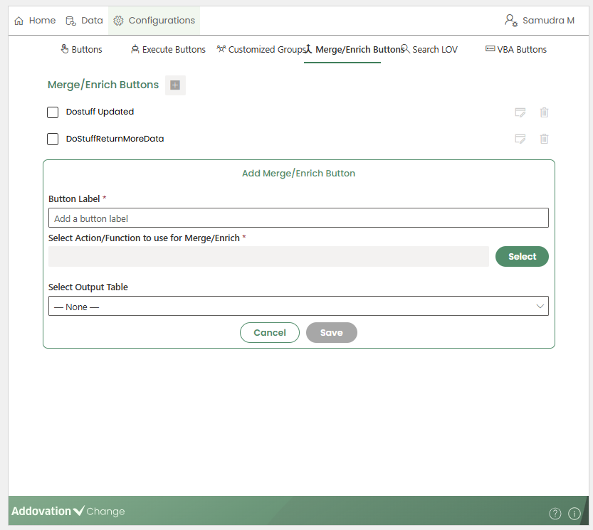 Saveto create the button.The newly created Merge/Enrich Button will appear on the Home page and can be invoked by users.