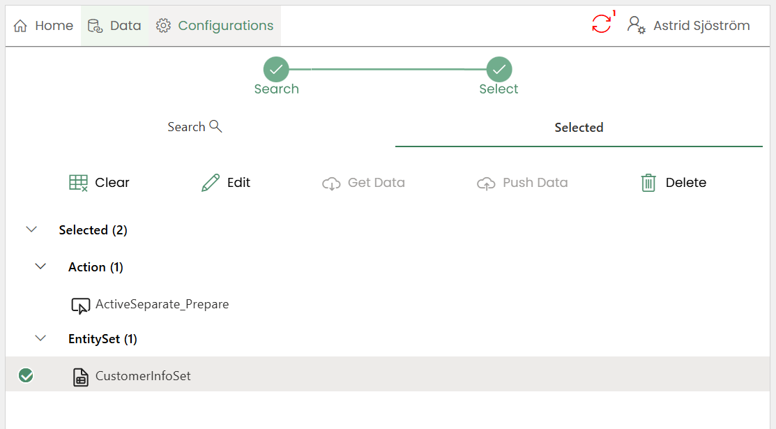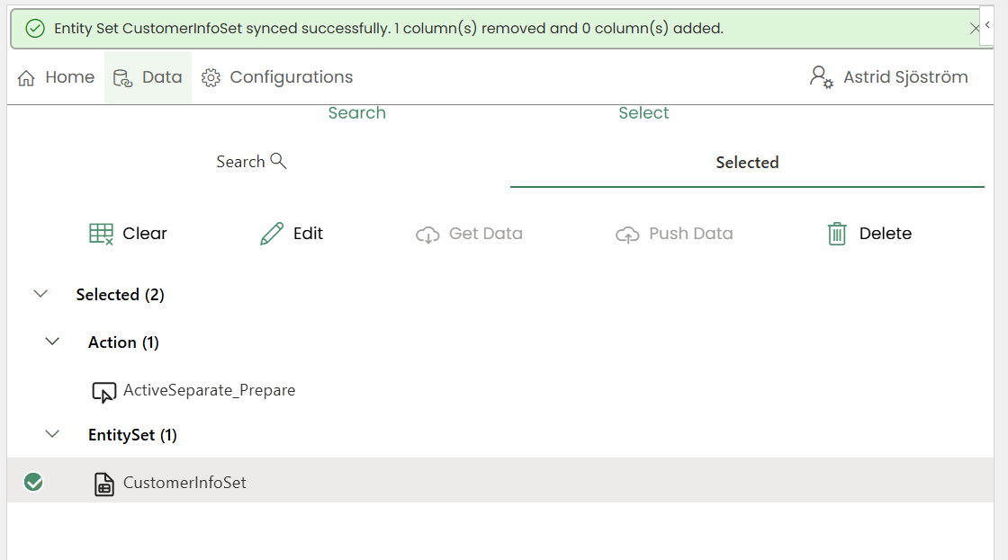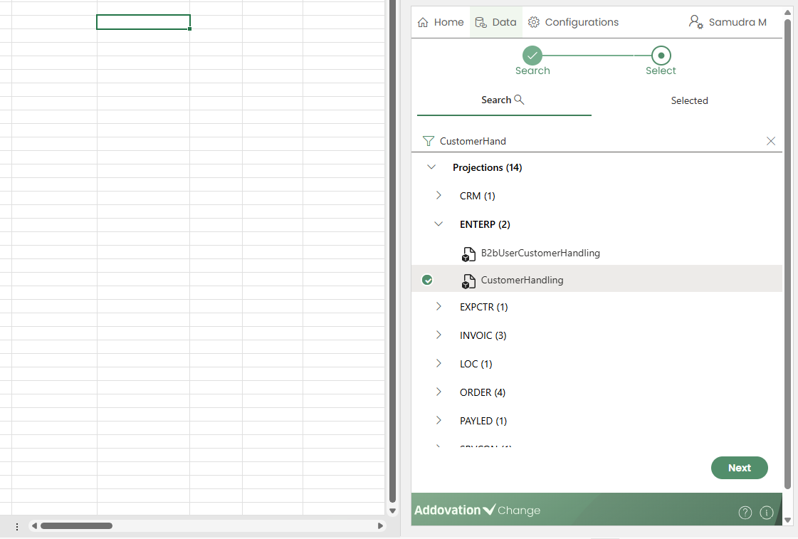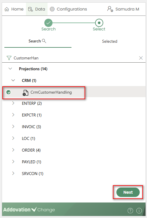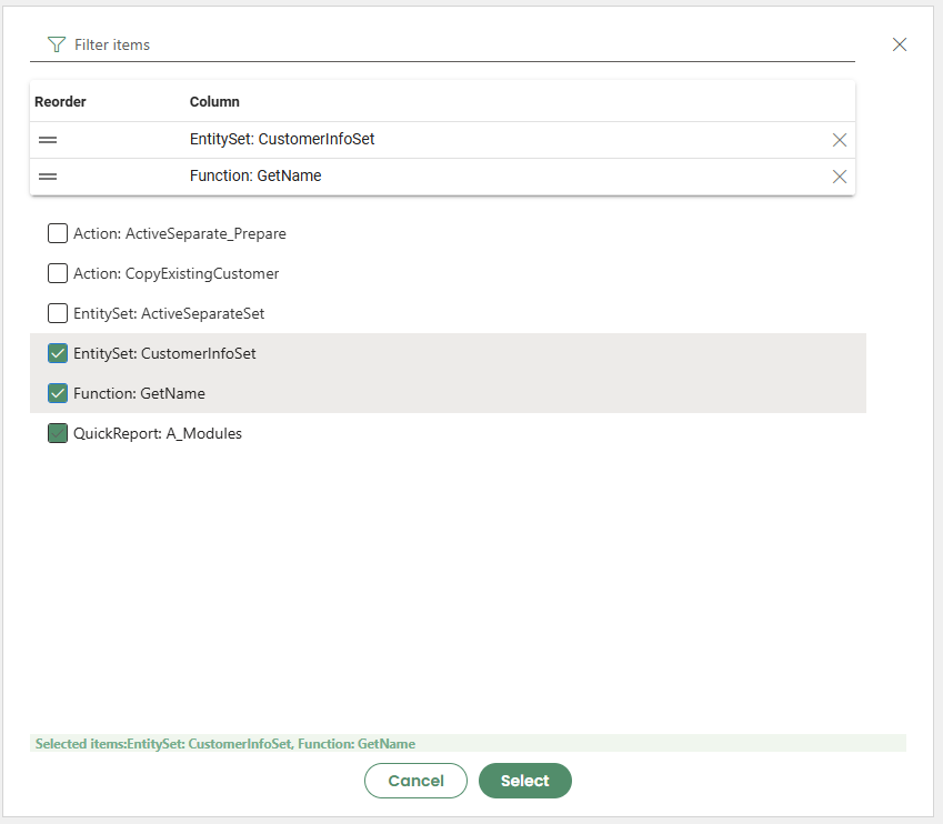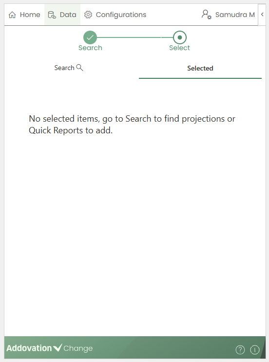 SearchandSelected.Searchtab allows creators to search for projections.Selectedtab displays a list of selected items categorized underEntity Sets,Actions,FunctionsandQuick Reports.A
