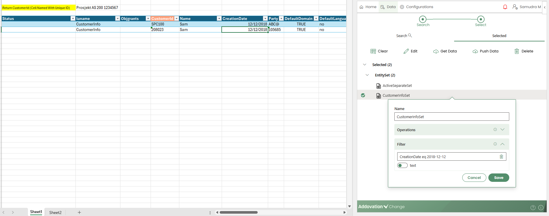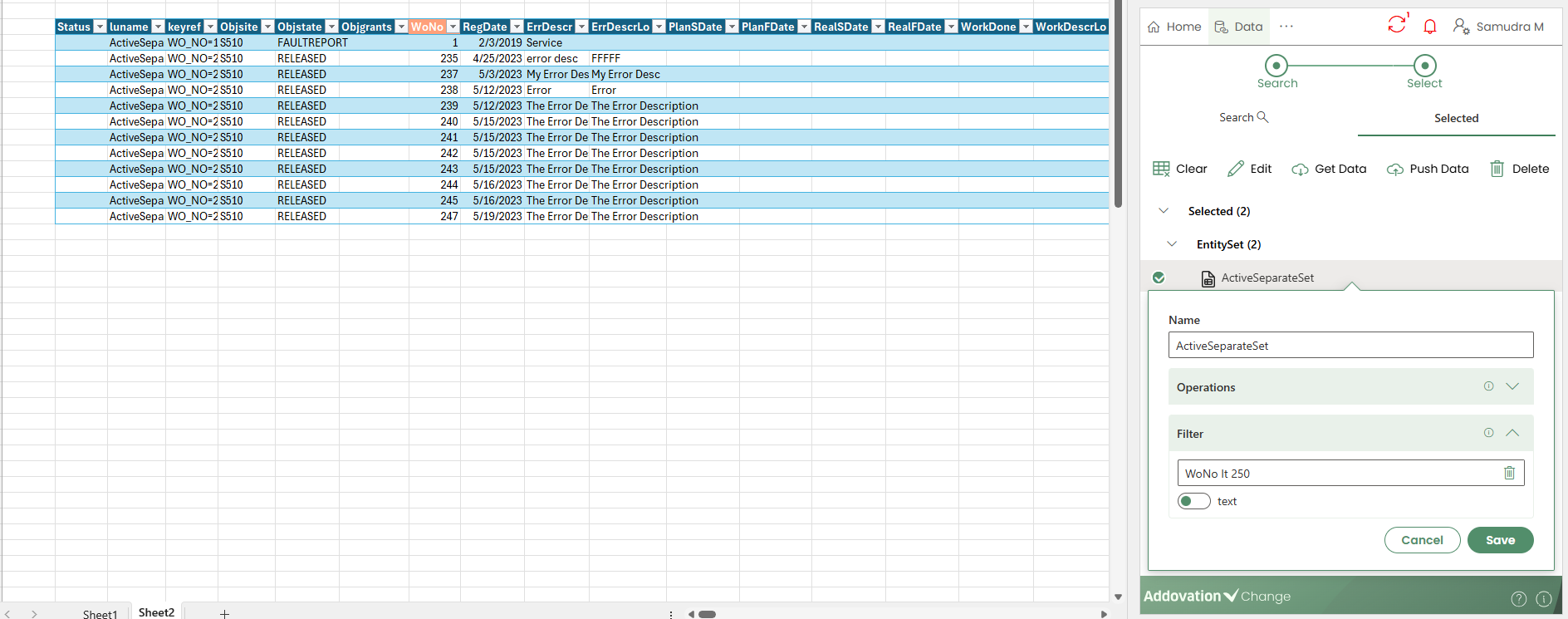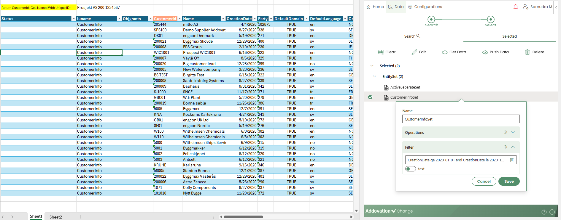 An Entity Set is represented as a table on the worksheet. Before inserting it, you must first select a cell in the Excel sheet where the table will be placed.
