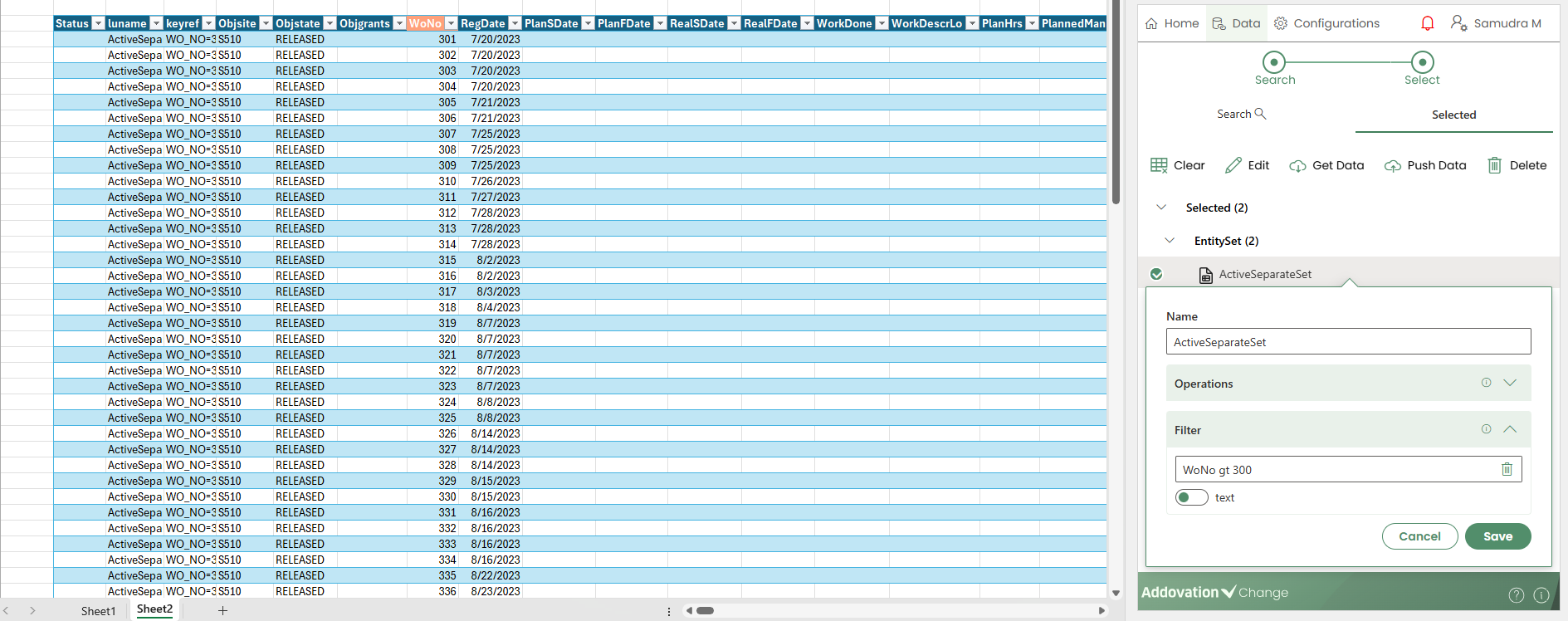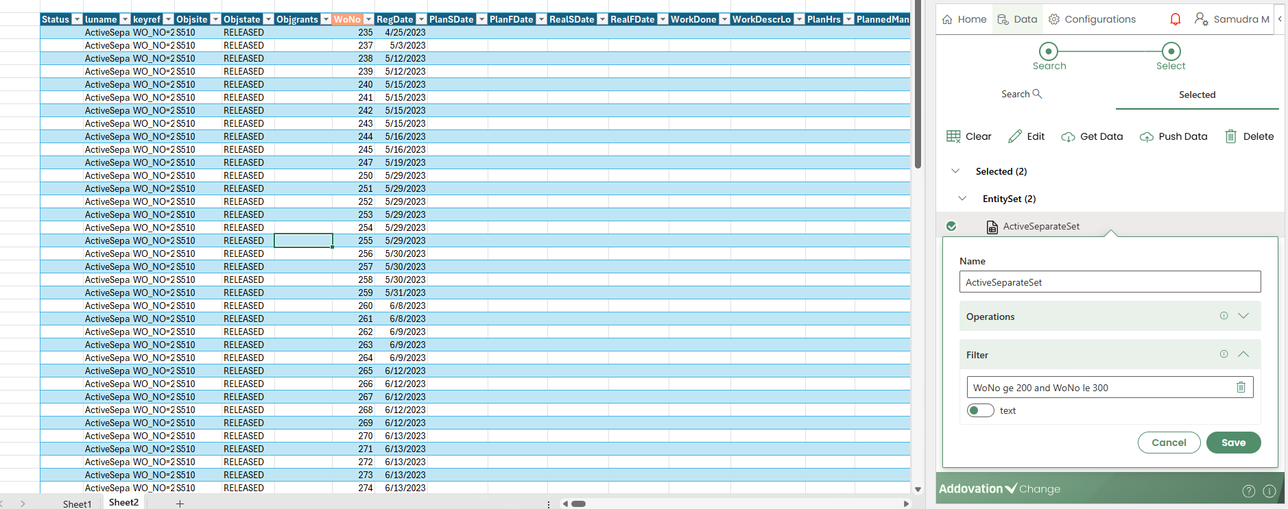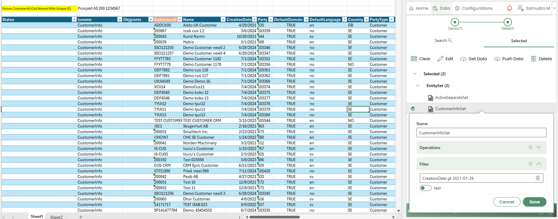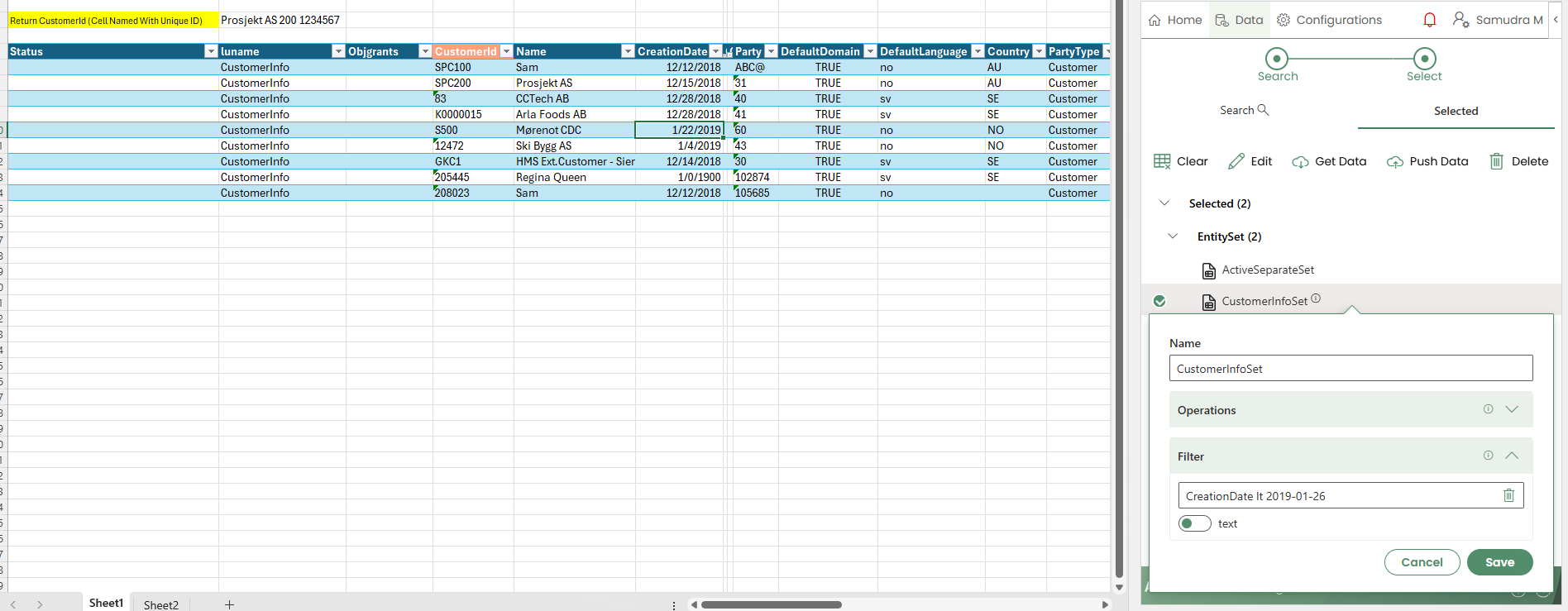 An Entity Set is represented as a table on the worksheet. Before inserting it, you must first select a cell in the Excel sheet where the table will be placed.