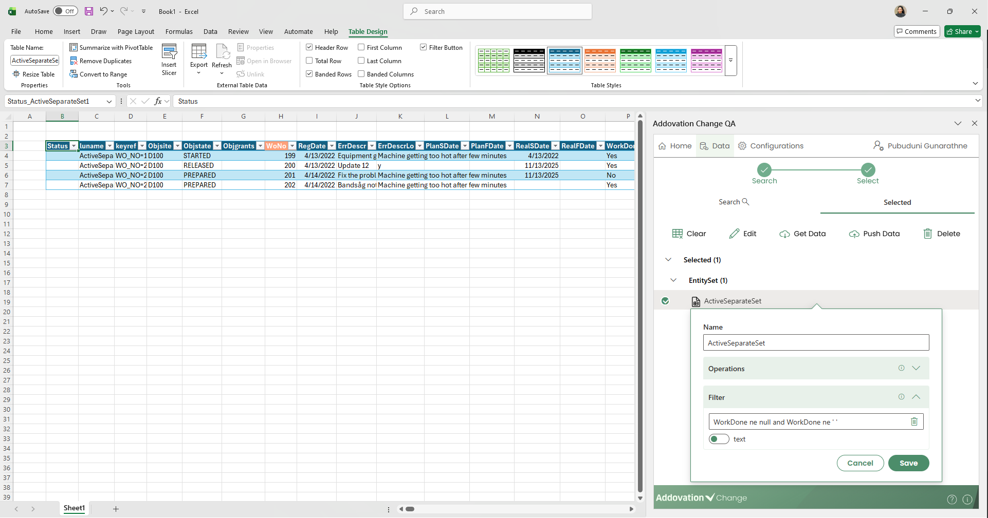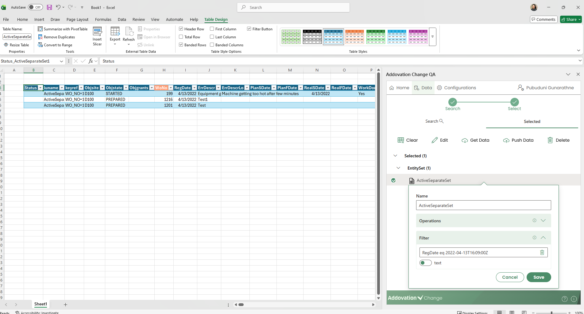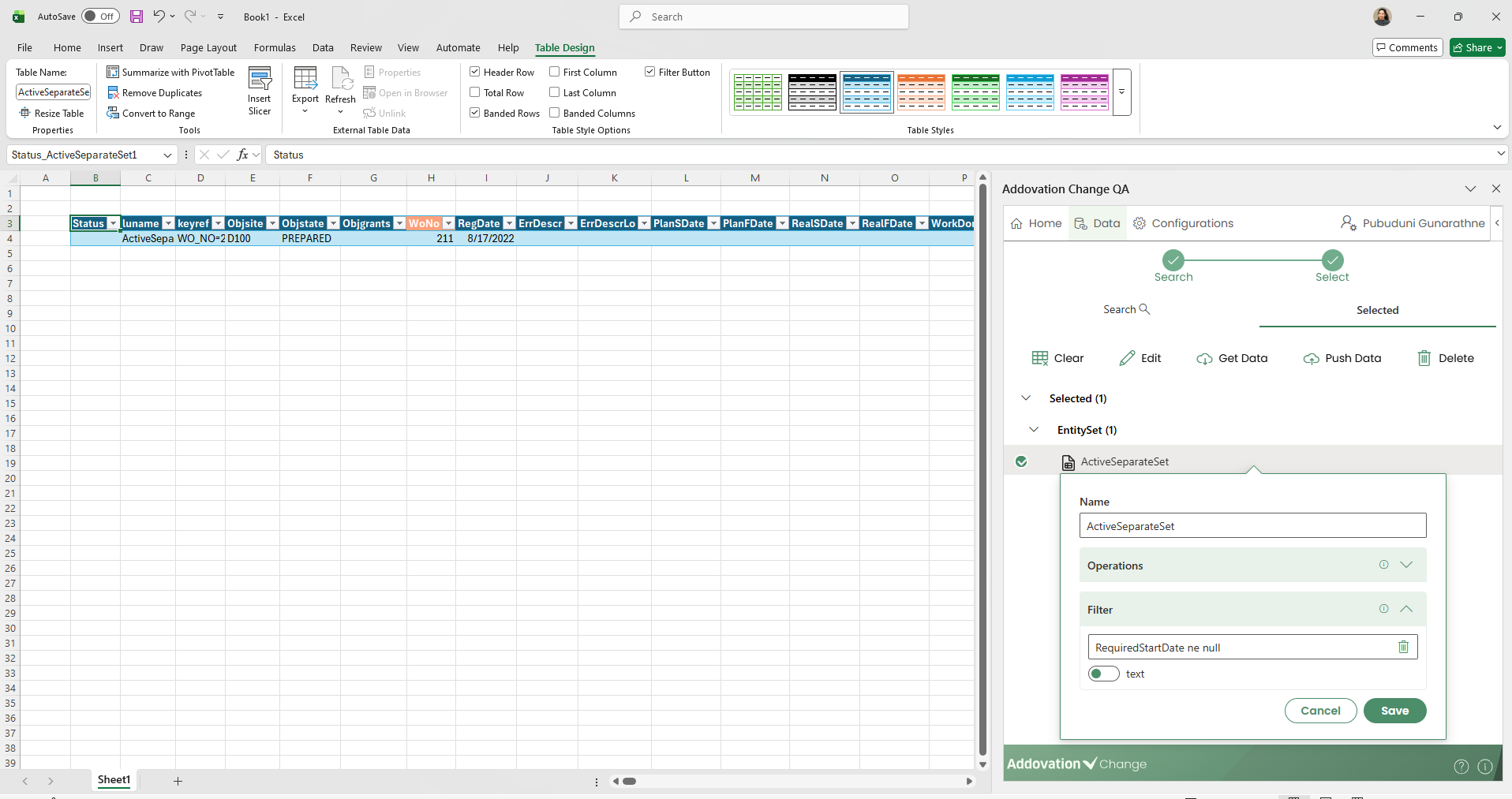 entity setsandquick reports are grouped together with anyactionsorfunctionslinked to the same Excel table and displayed in the home tab.Actions and functions that are connected to