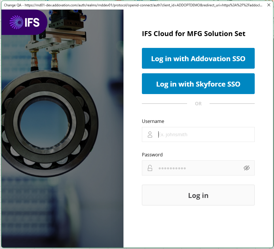 IFS Authenticatorwindow appears, allowing the user to:- Enter their username and password, or