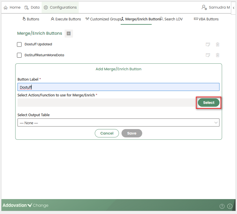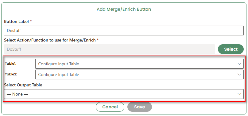 Next, select the relevant action to associate with the Merge/Enrich Button by clicking the