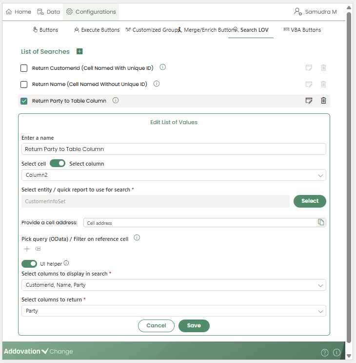 When a user clicks the configured trigger cell, the Search LOV table opens in the Change add-in pane.