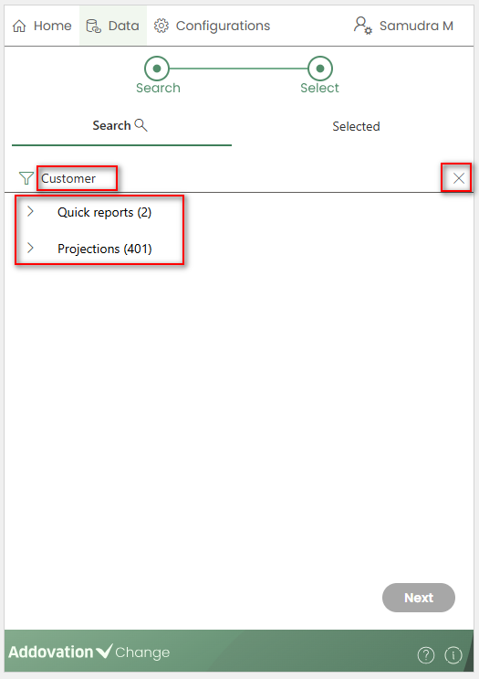Nextbutton remains disabled until a projection or quick report is selected.