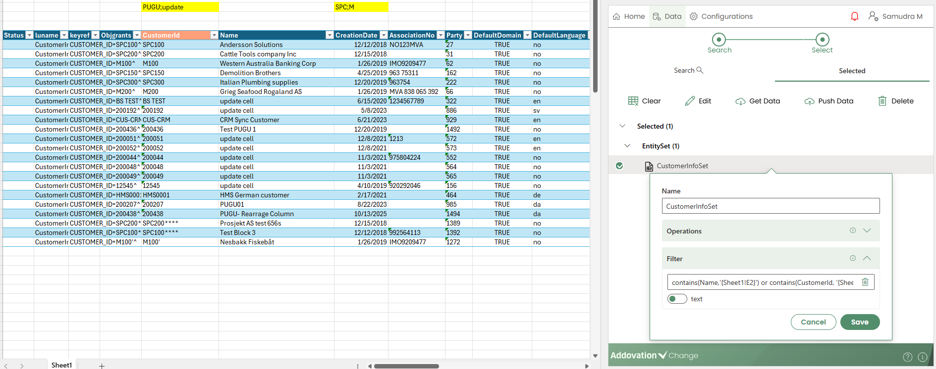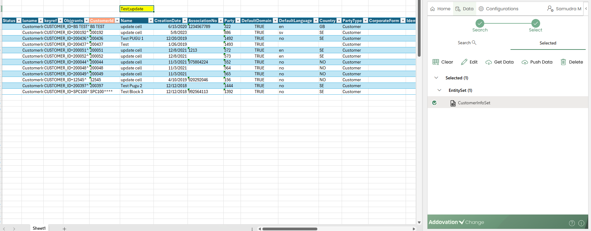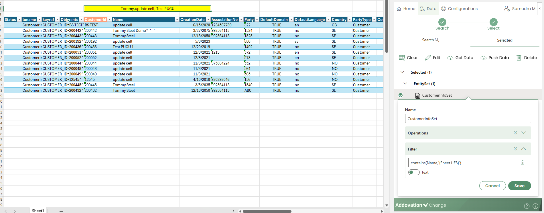 When a user clicks any cell within the configured trigger column, the Search LOV table opens in the Change add-in pane.