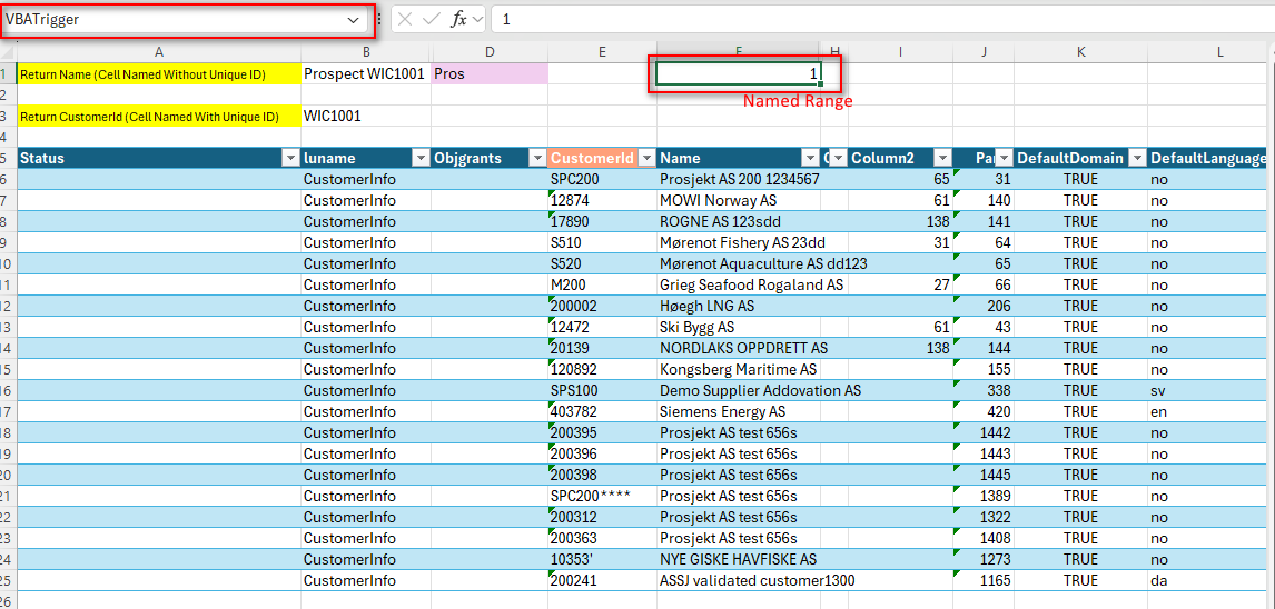 - When returning values to a named cell, it is mandatory that the target cell is named using the same name as the return column header. This ensures that the selected value is populated correctly.
