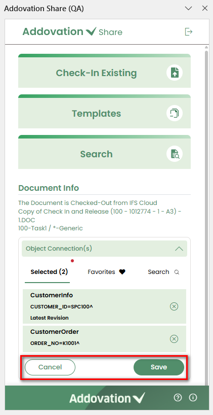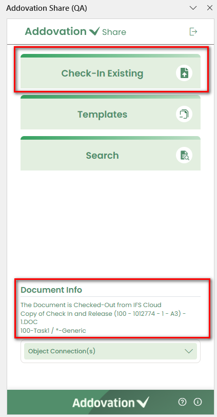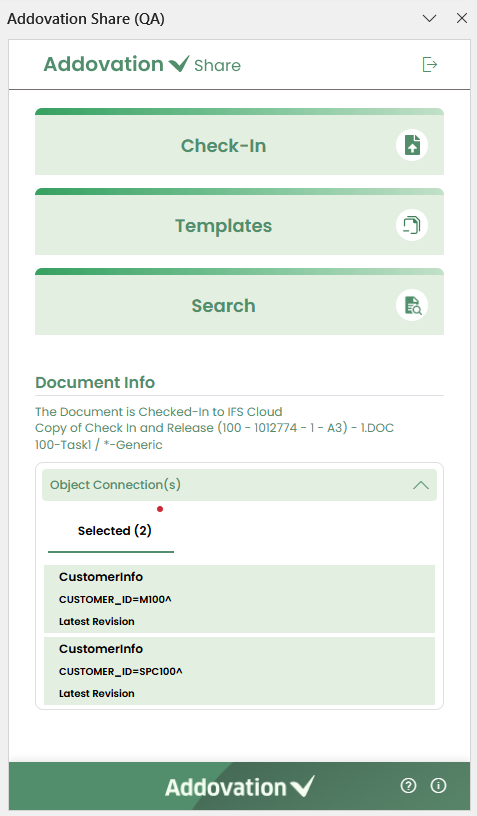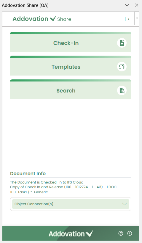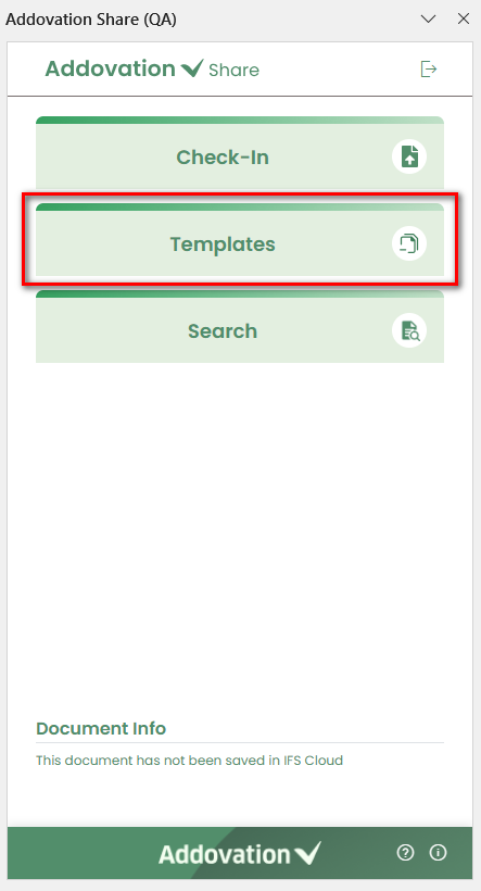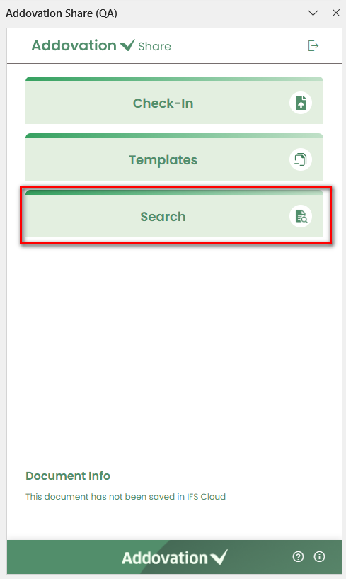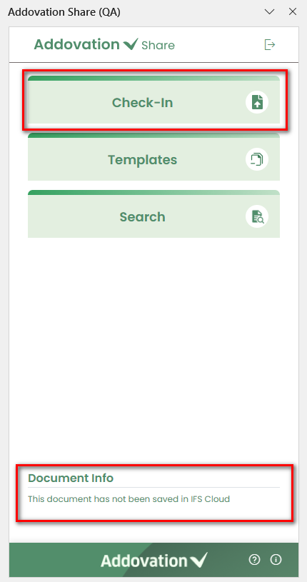 Check In– Check in a document to IFS.Templates– Search for and create documents using templates.Search– Search for existing documents.