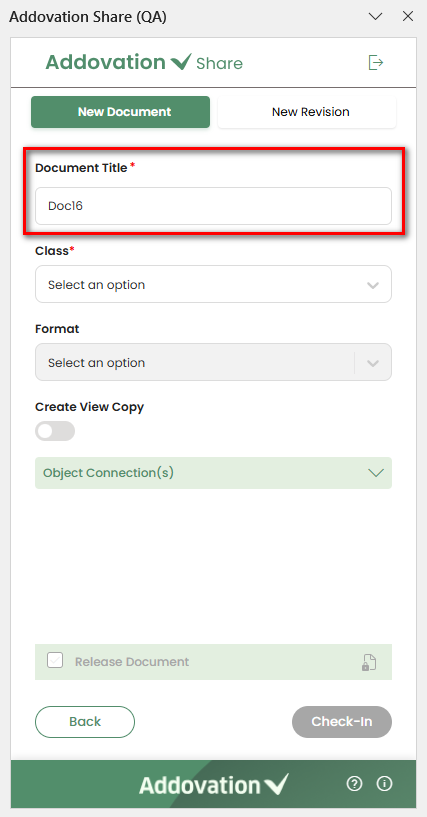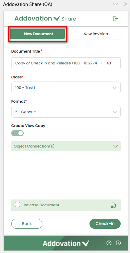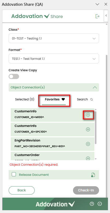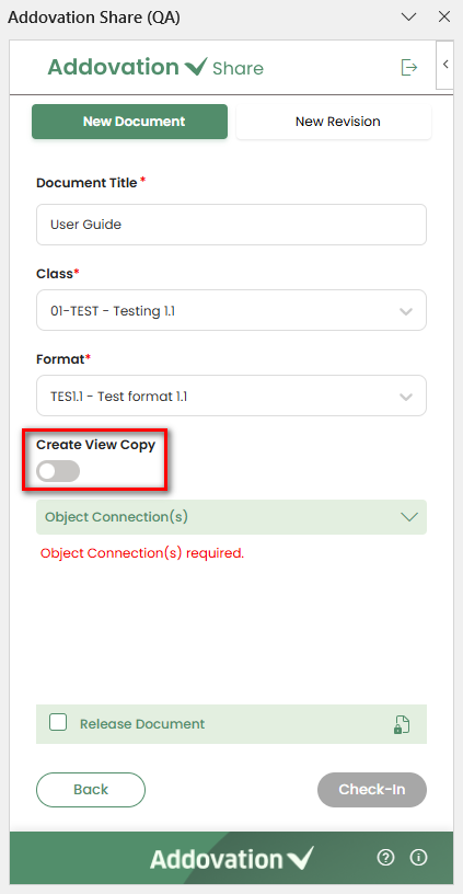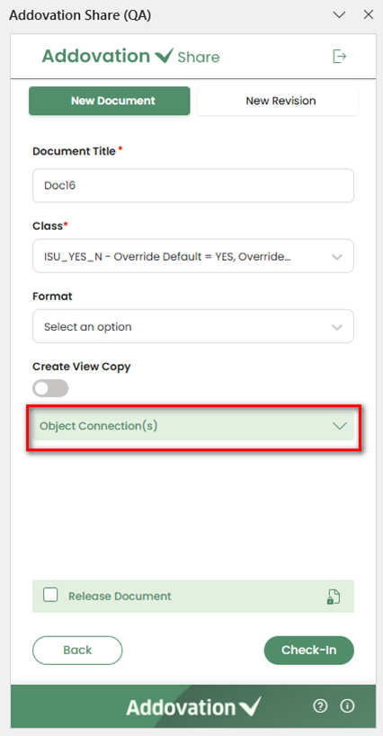 The document can be checked-in without an object connection. However, in some situations, the object connection is required. If the object connection is required, a message will be displayed inside the object connection section stating "Object Connection(s) required" and the Check-in button will remain disabled until an object is selected.