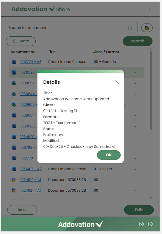 Backbutton will return the user to the Share Add-in home page.Below these controls, a list of up to 25 documents is displayed, sorted by the last action. Each document shows the following details: