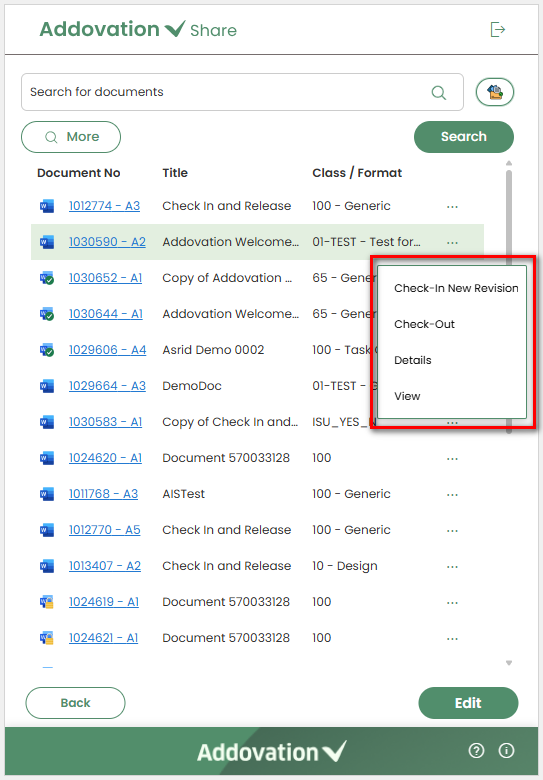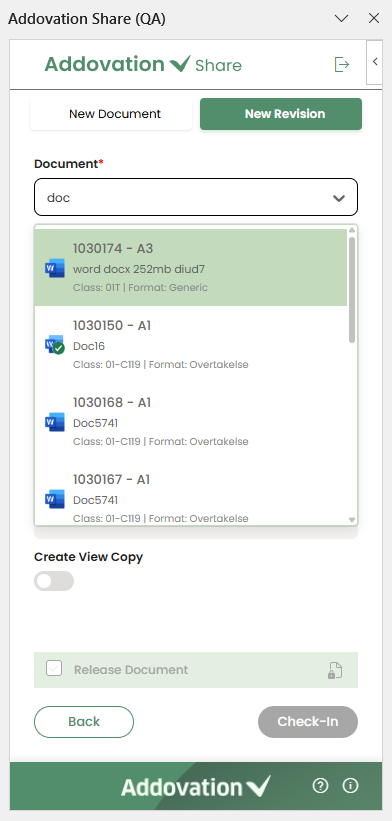 Check In New Revisionfrom the options menu, a new revision of the document is created. The existing document in the list is replaced with this new revision, while the previous revision remains accessible in IFS if required. This option is disabled for documents that are currentlychecked out.If the user selects