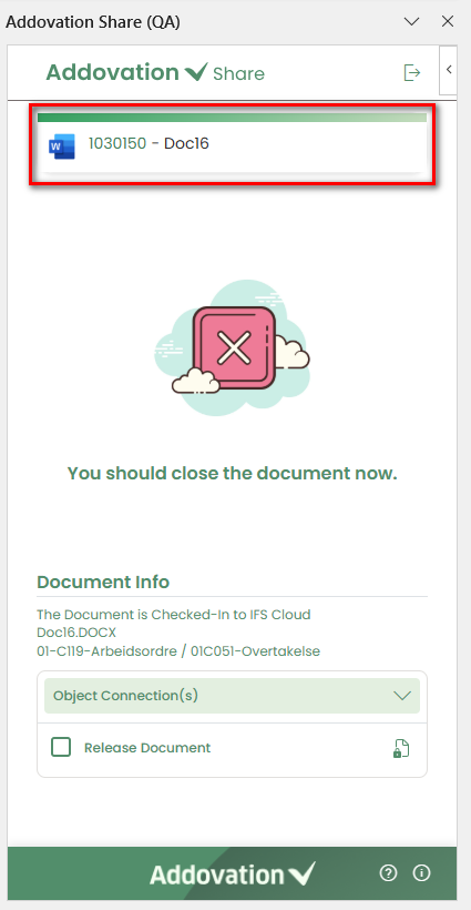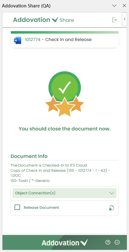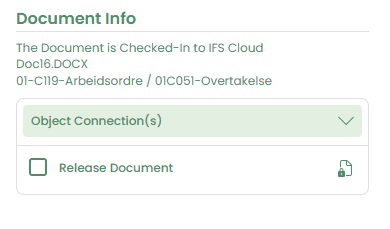 confirmation messageis shown, theIFS Document Numberappears as a clickable link, and both theObject Connectionssection and theRelease Documentoption remain editable after check-in.