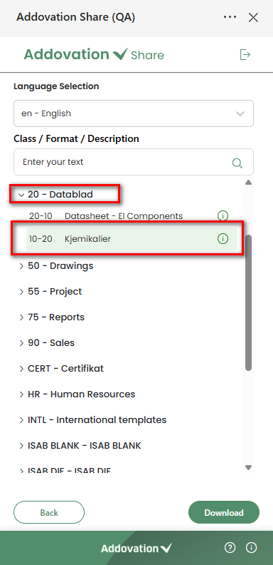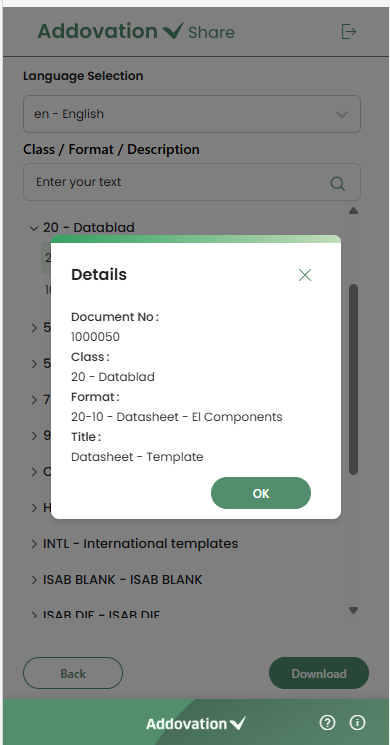 informationicon will open a detail pop-up showing more information about the selected template. The following details will be displayed in the pop-up:- Document Number