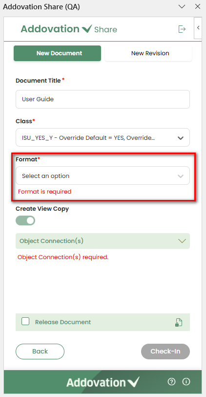 Formatcan be selected using the drop-down menu and format values are listed based on the selected class. The Format drop down remains disable until a class is selected. The document can be checked-in without a format. However, in some situations, the format is required.If the format is required for the selected class, a message stating