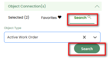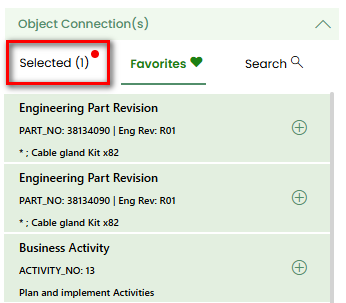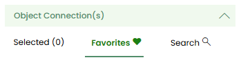 Selected,FavoritesandSearch.Favorites: Displays the object connections marked as favorites in the IFS.Selected: The object connections that have been selected will appear in this tab and can be managed.Search: Provides the advanced search functionality.