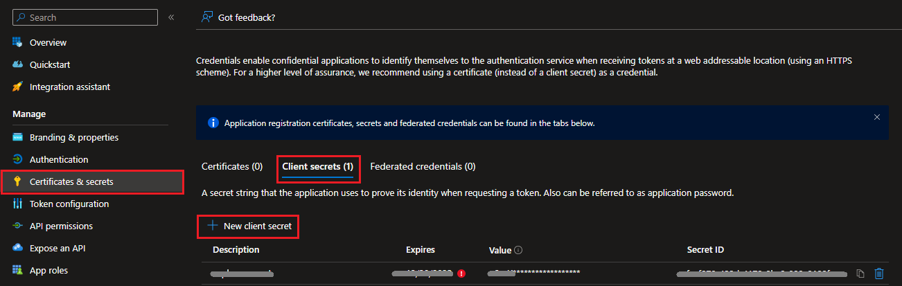 Certification & Secret--> SelectClient secretstab --> ClickNew client secret
