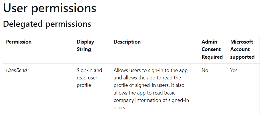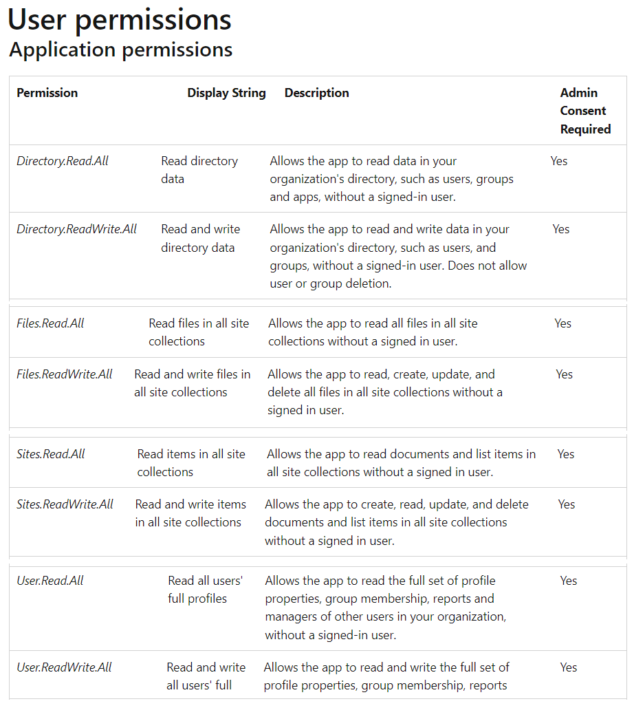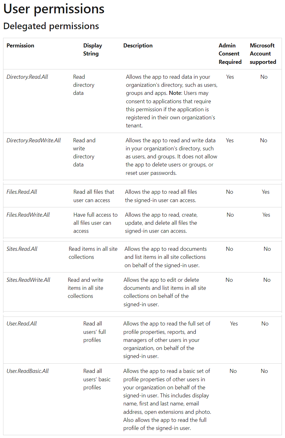 For an app to access data in Microsoft Graph, the user or administrator must grant it the permissions it needs. This topic lists the delegated and application permissions exposed by Microsoft Graph.