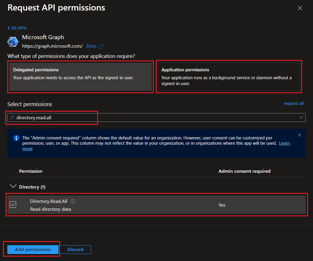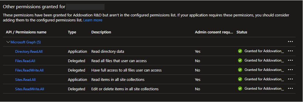 - Add following API permissions to the Application and grant admin consent for tenant.