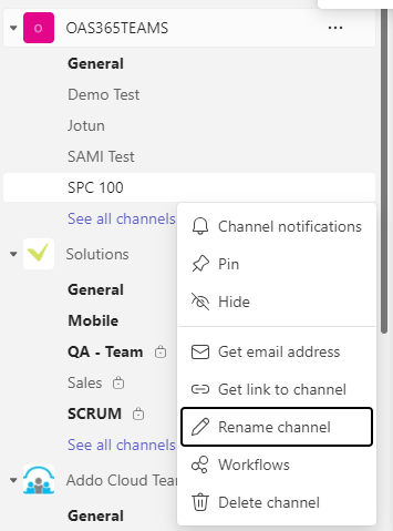 - Go to the Teams channel's configuration menu (the "..." button to the right of the channel name) and select 'Rename channel' from the context menu to update the channel description.