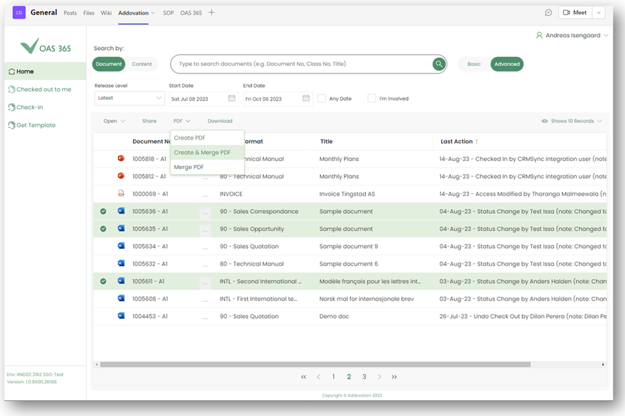 | 2025-12-17 | Preview 1.2.43 | Enhancements & Improvements Working Documents - Performance Improvements for Working Documents Working Documents - Standardized the Document Details panel to align with other Addovation Share products All Documents - Document Search Using Standard Projections (Customers can activate this option via a simple configuration setting) Improved Error Handling and User Feedback A notification is shown directing users to use the Channel App when opened from the General Channel or General tab Bug Fixes Enhanced the user login prompt displayed when authentication tokens expire Added missing toast notifications for Deleting OneDrive documents during check-in and Document check-out actions Check In New - Improved Dark Theme compatibility for the Class / Format selection panel Check In Exiting - Resolved an issue where the Check-In Existing button was not functioning when View Copy was mandatory during Check-In New RevisionAll Documents - Fixed an issue where IFS documents failed to load for certain object connections when using custom projections |