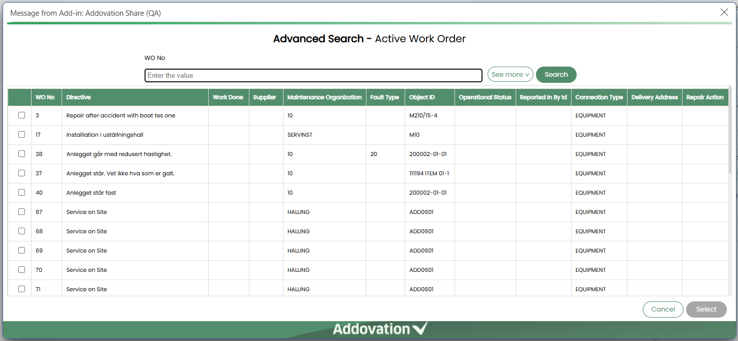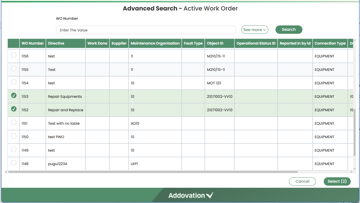 Searchbutton to initiate the search.The system will load a list of search results based on the entered criteria into a grid. Users can select one or more search results by checking the
