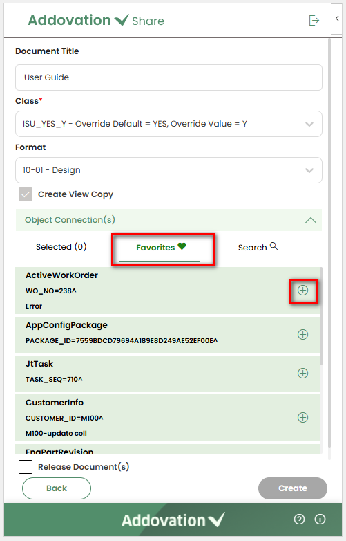 Favoritesobject connection will be selected by default. User favorites object connections are the once user selected as favorites in Document Object Connections in IFS.