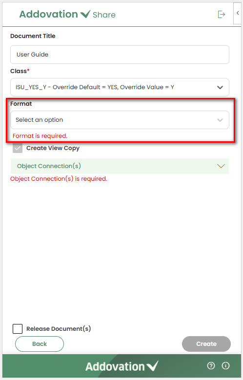 Formatcan be selected using the drop-down menu and format values are listed based on the selected class. The document can be checked-in without a format. However, in some situations, the format is required.If the format is required for the selected class, a message stating