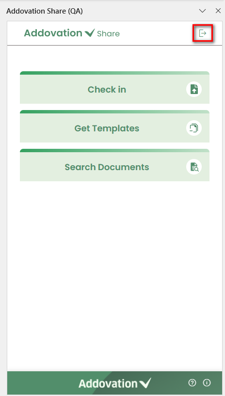 - Once signed in, the user gains access to the landing page. To log out of the application, the user can click the logout icon provided at the top right corner of the add-in.