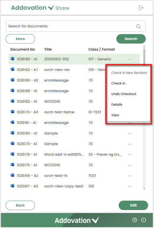 When the user clicks the three dots button next to a document (right corner of the record), a menu will appear with the following options: