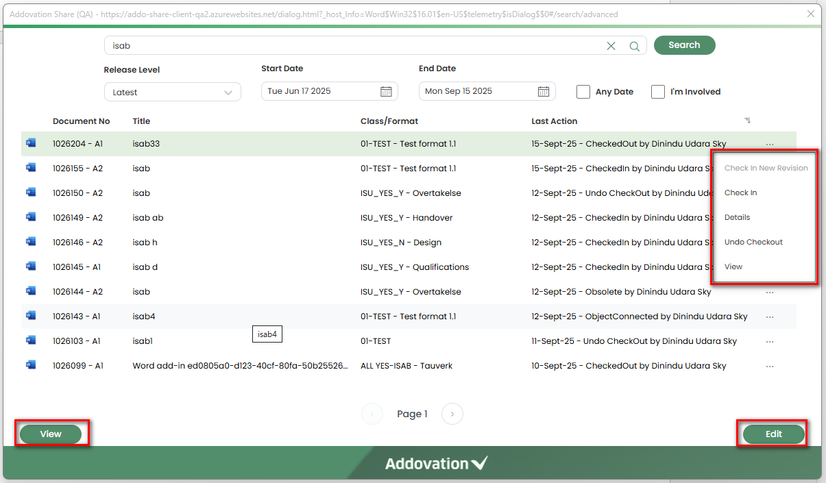 Check-Out, the document will be checked out from IFS. Once checked out, the menu label will change toUndo Check-Out, allowing the user to revert the action if needed.The