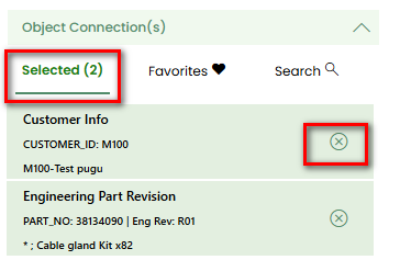Favorites,SelectedandSearch.Favorites: Displays the object connections marked as favorites in the IFS.Selected: The object connections that have been selected will appear in this tab and can be managed.Search: Provides the advanced search functionality.