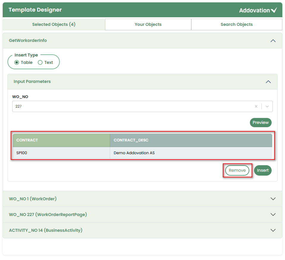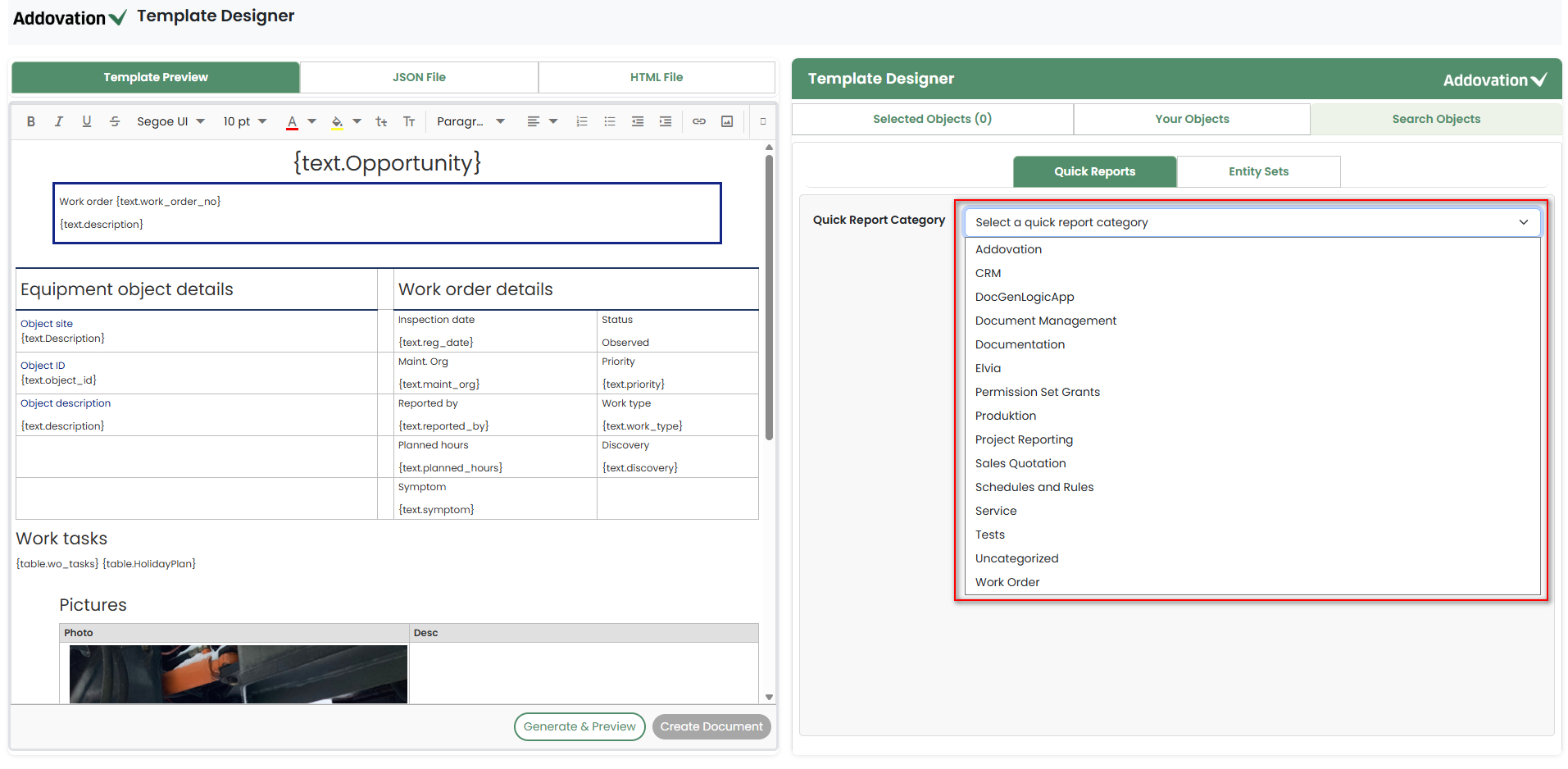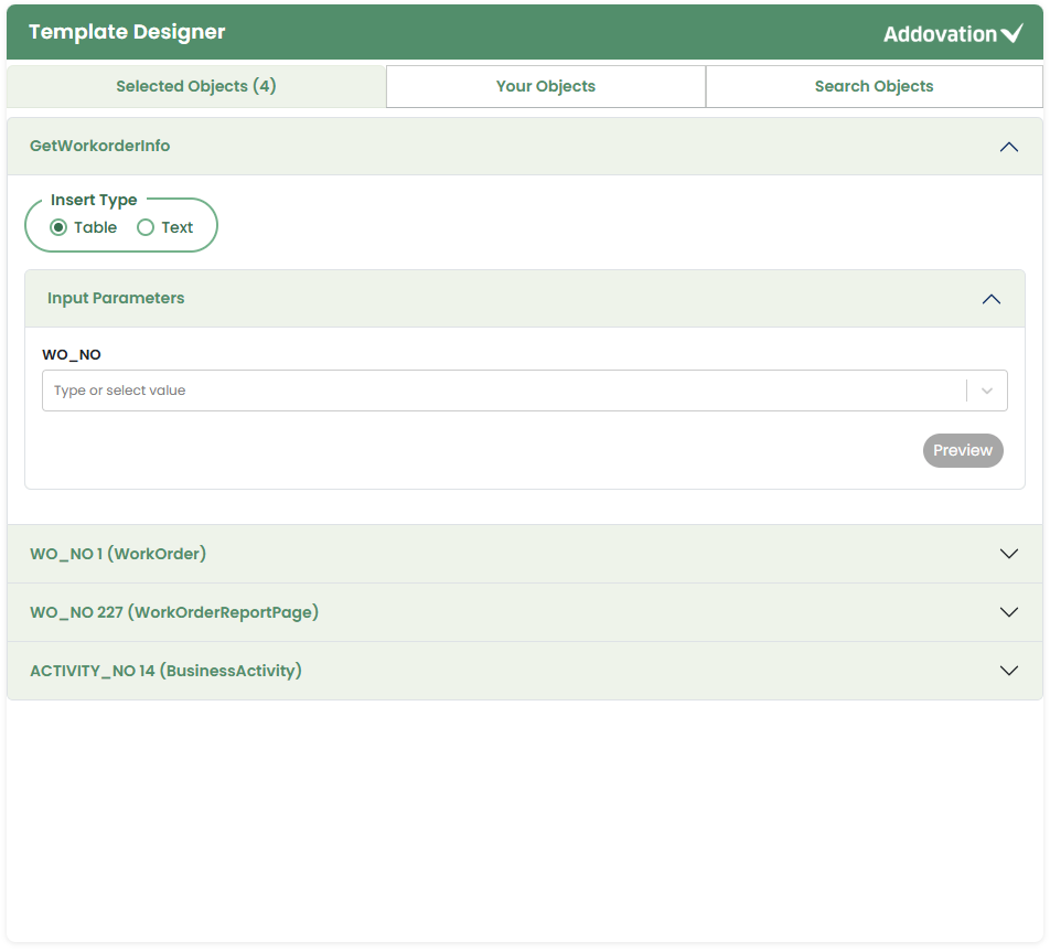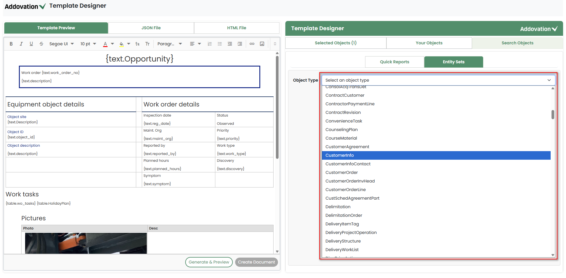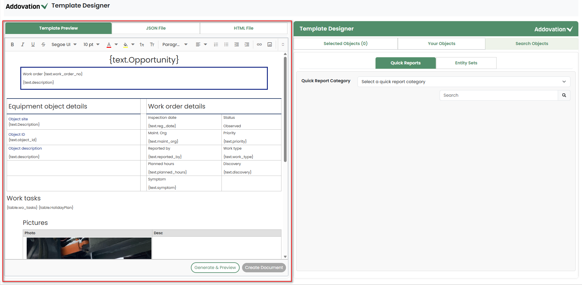 Placeholders defined in the template will be visible, allowing the user to populate them with the required objects or tables.