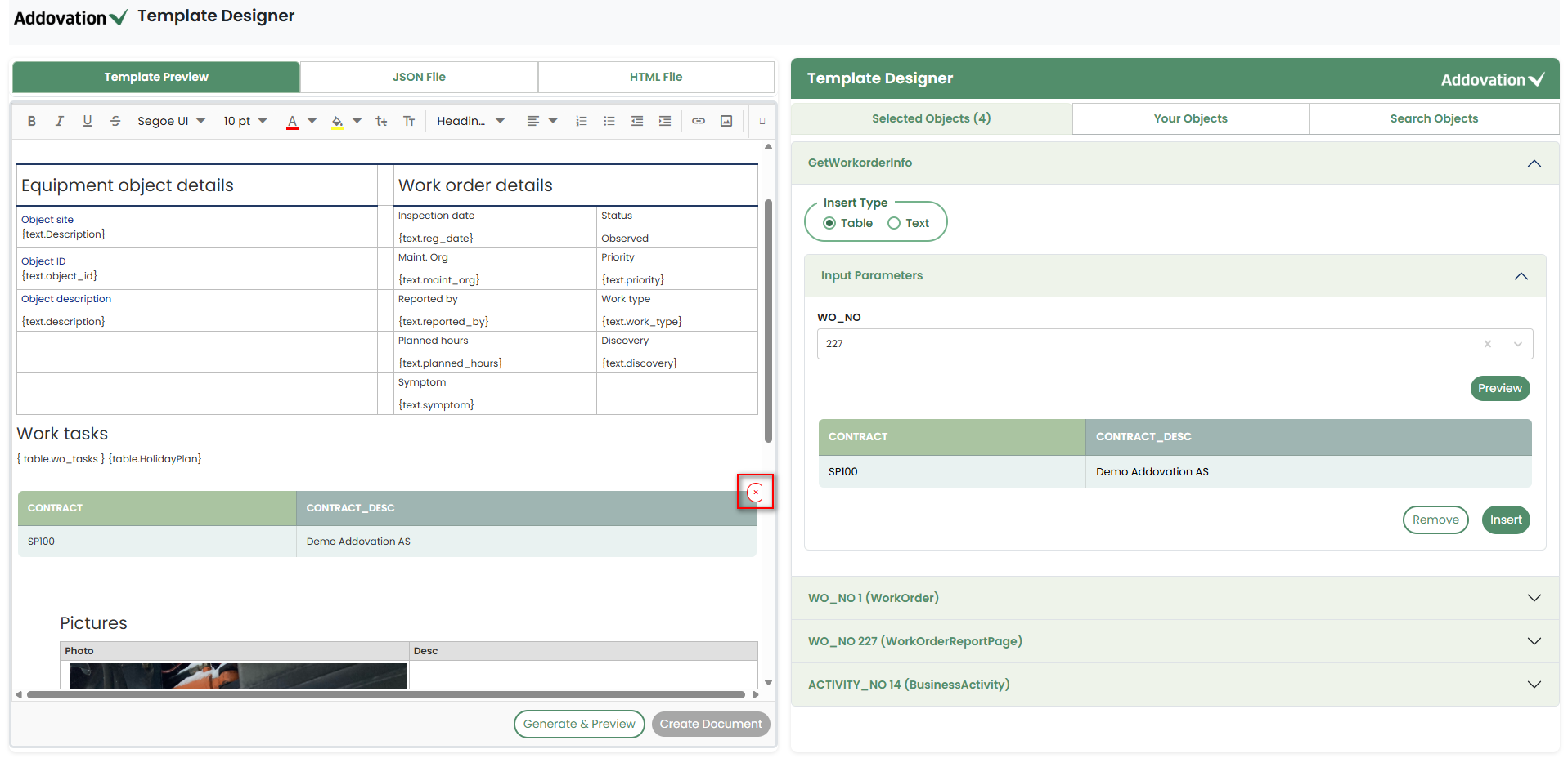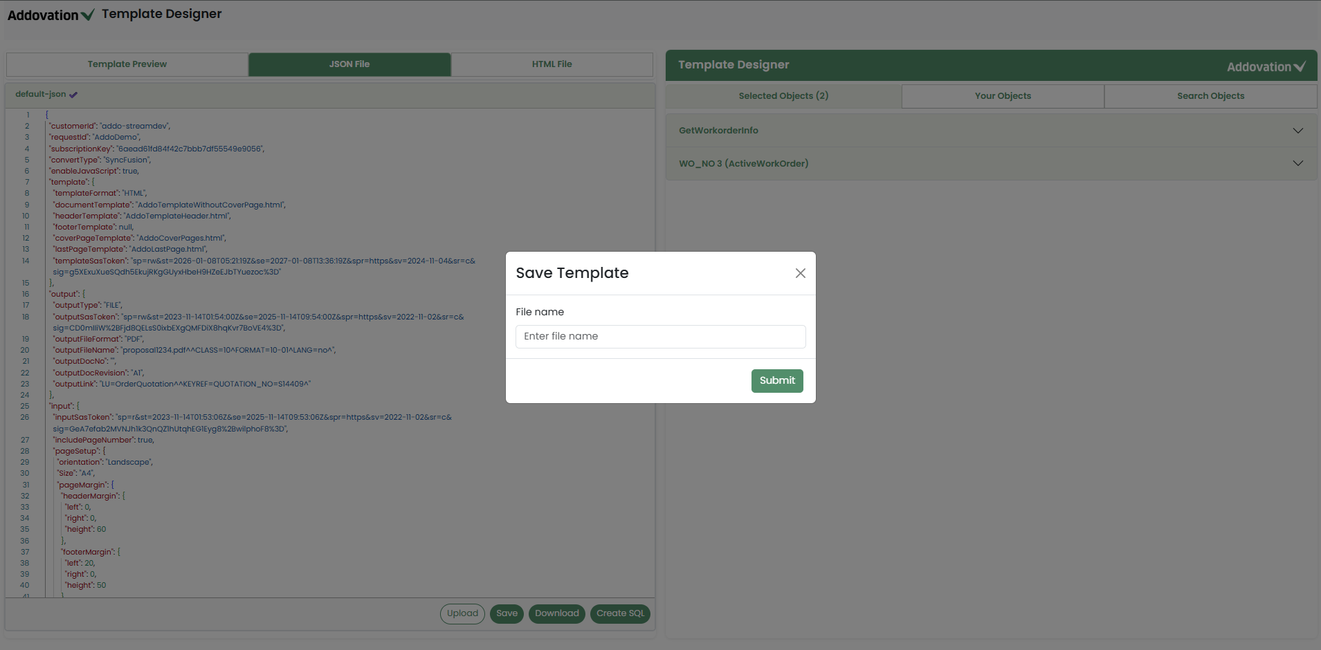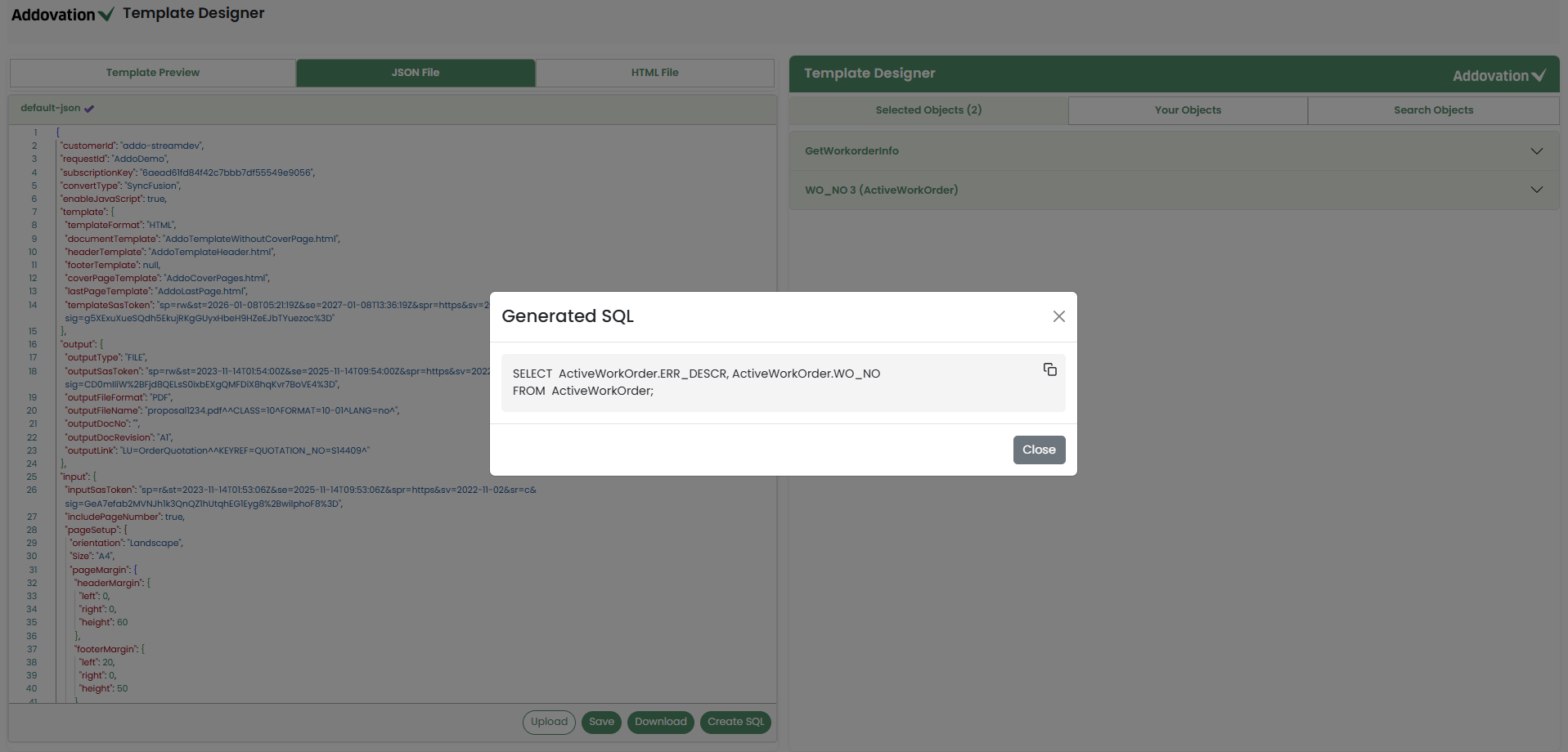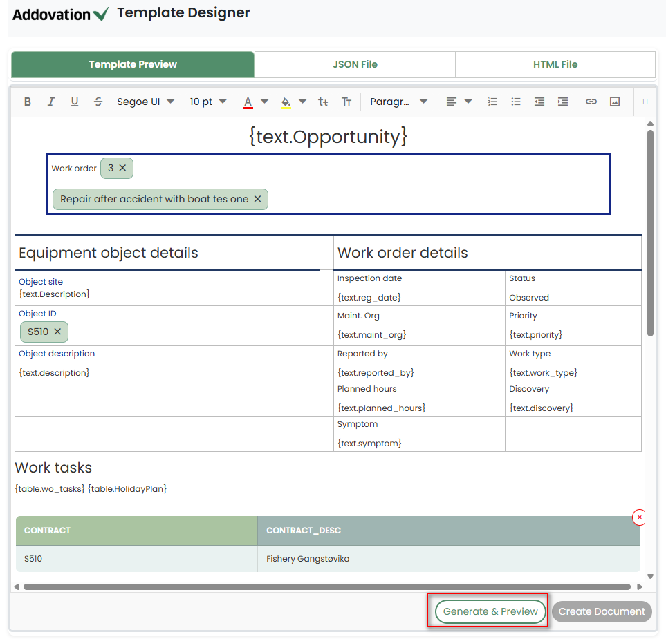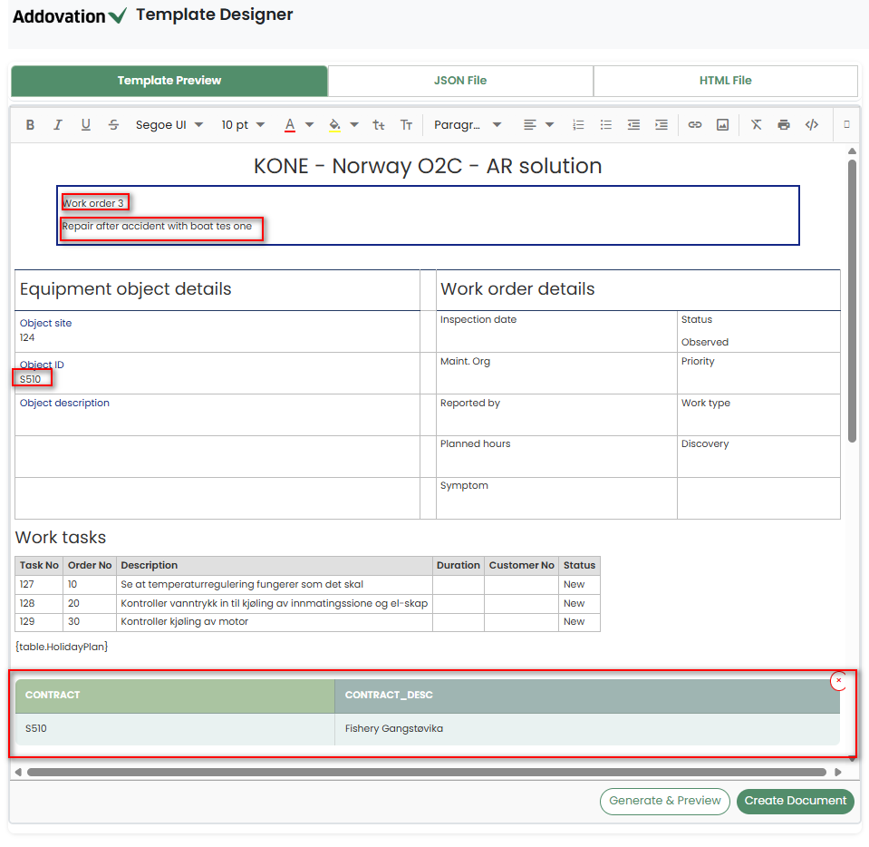 If the JSON already contains values for those placeholders, they will be replaced with newly added values from the Template Designer.