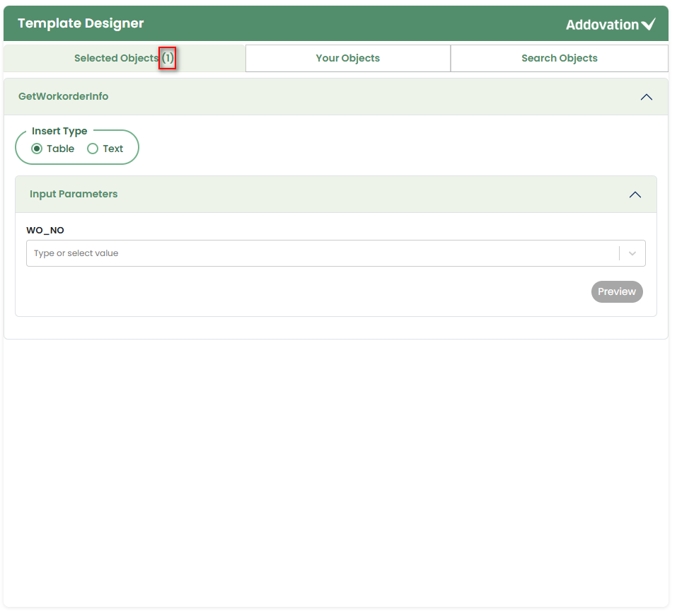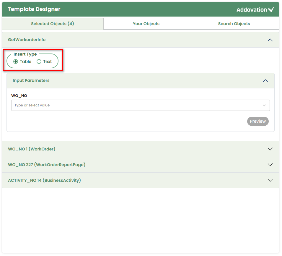 If the user selects Table, the entire table will be inserted into the template.