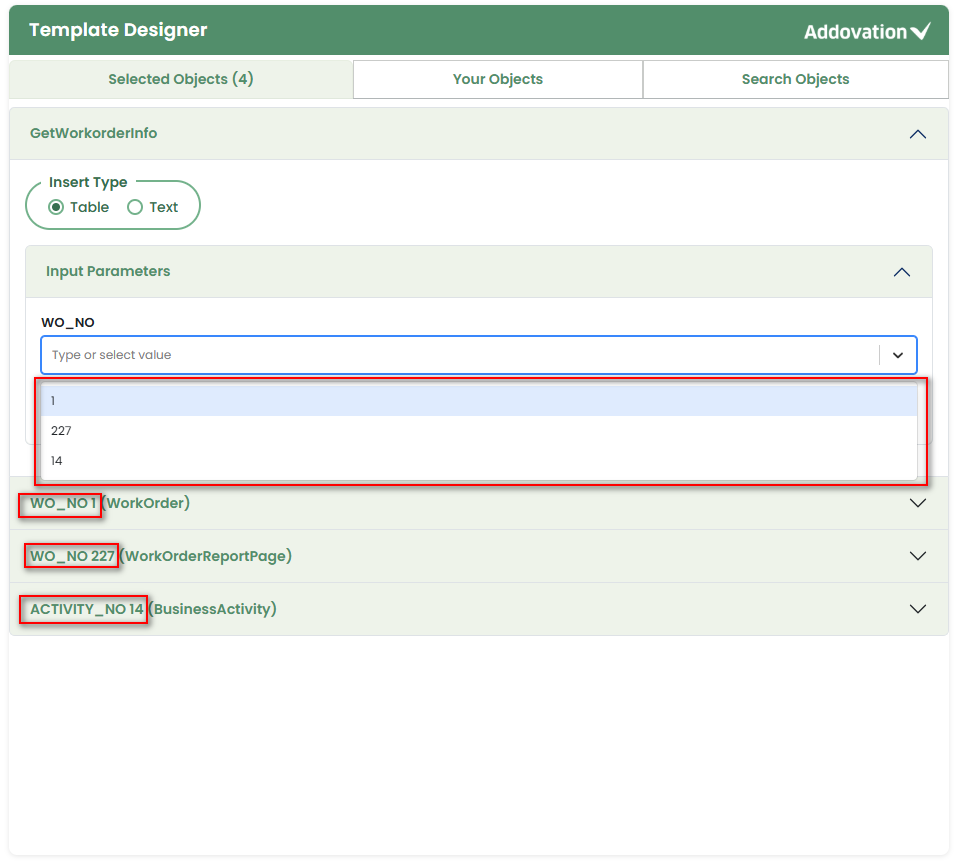 For each input parameter, if any objects exist in the Selected tab from previous selections, they are displayed as selectable options, allowing the user to choose or type a value.