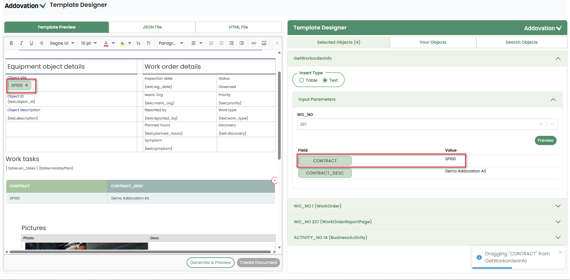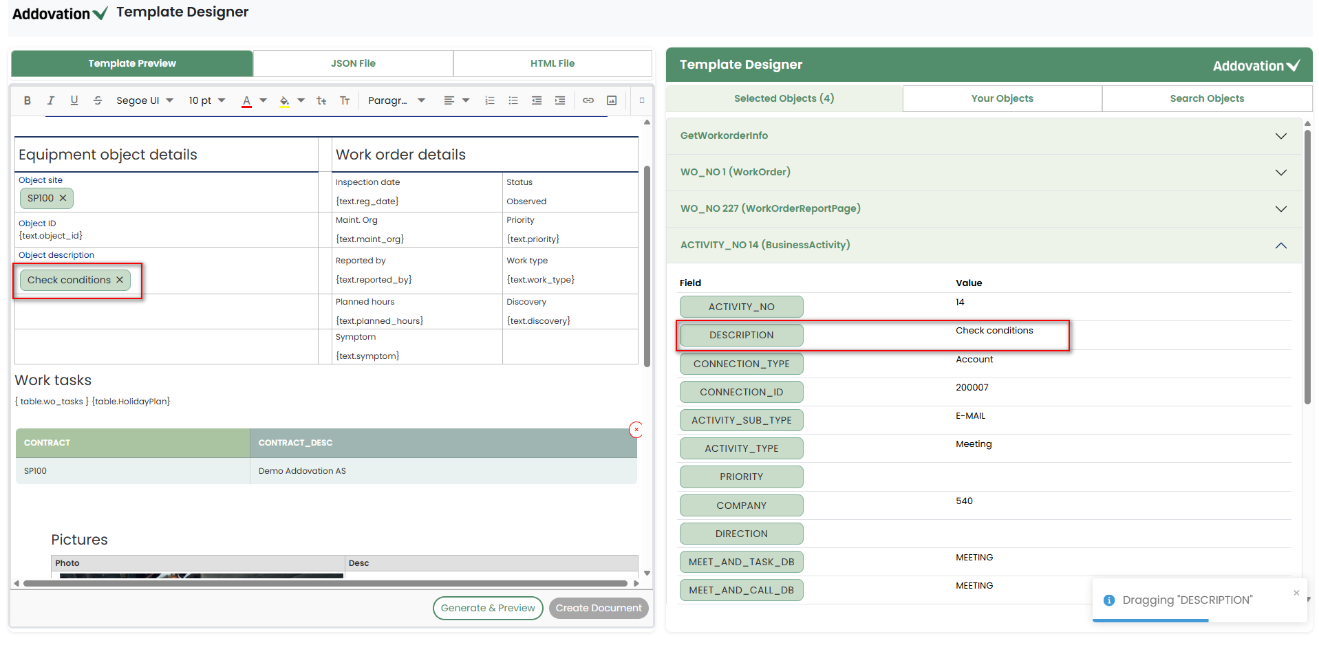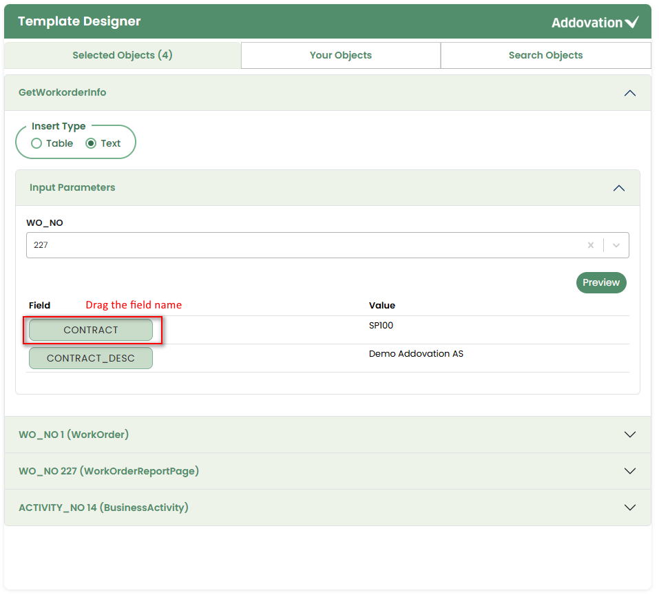 dragthe required field name anddropit into the placeholder at the desired location in the Template Preview.