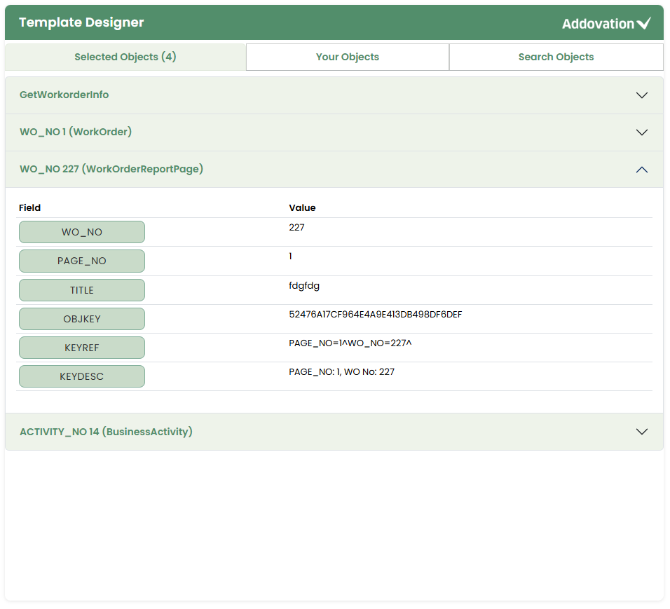 Within this section, the user will see a list of fields from the object along with their corresponding values.