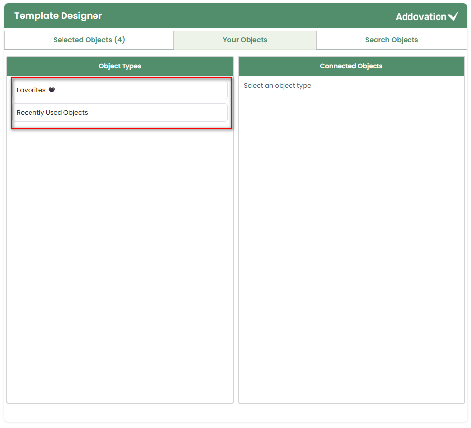 FavoritesandRecently Used ObjectTypes.On the left side, two sections are available: Favorites and Recently Used Object Types.