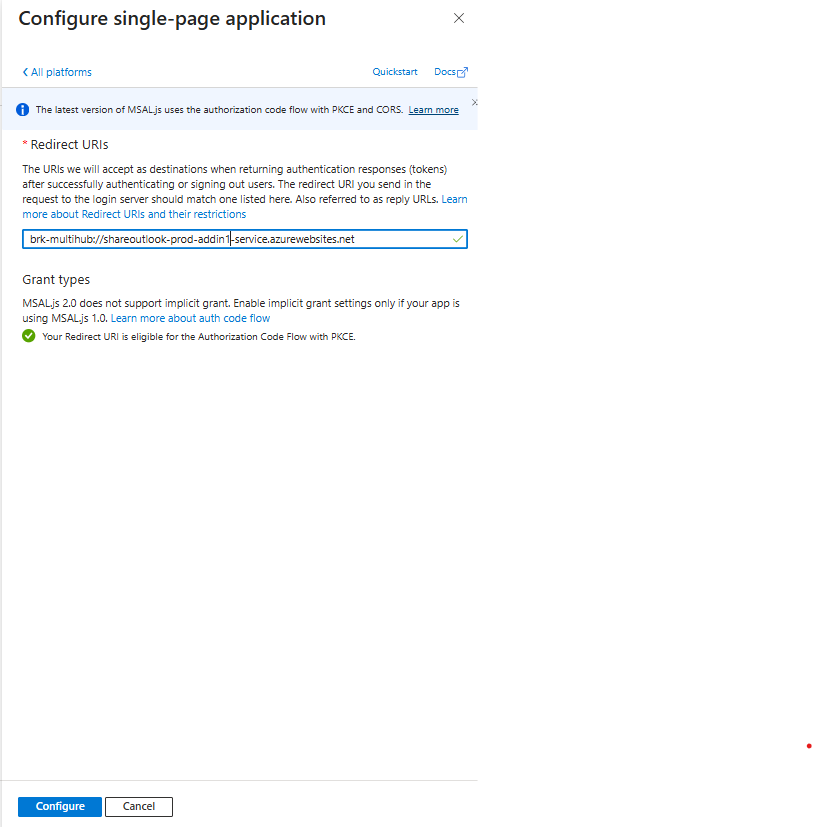 and add the Urls as "brk-multihub://sync-meetings-addin-a2efehhpemgqdafm.norwayeast-01.azurewebsites.net" and "brk-multihub://sync-contact-addin-bagzcbg5brergpcr.norwayeast-01.azurewebsites.net" and click on 'Configure'.